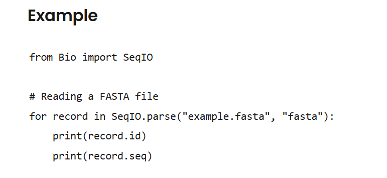 Biopython مجموعهای از ابزارها برای محاسبات زیستی است. این کتابخانه قابلیتهایی برای خواندن و نوشتن فرمتهای مختلف فایل توالی، انجام تحلیل توالی و کار با پایگاههای داده زیستی ارائه میدهد. این کتابخانه یکی از ارکان برای مبتدیان بیوانفورماتیک در پایتون است.