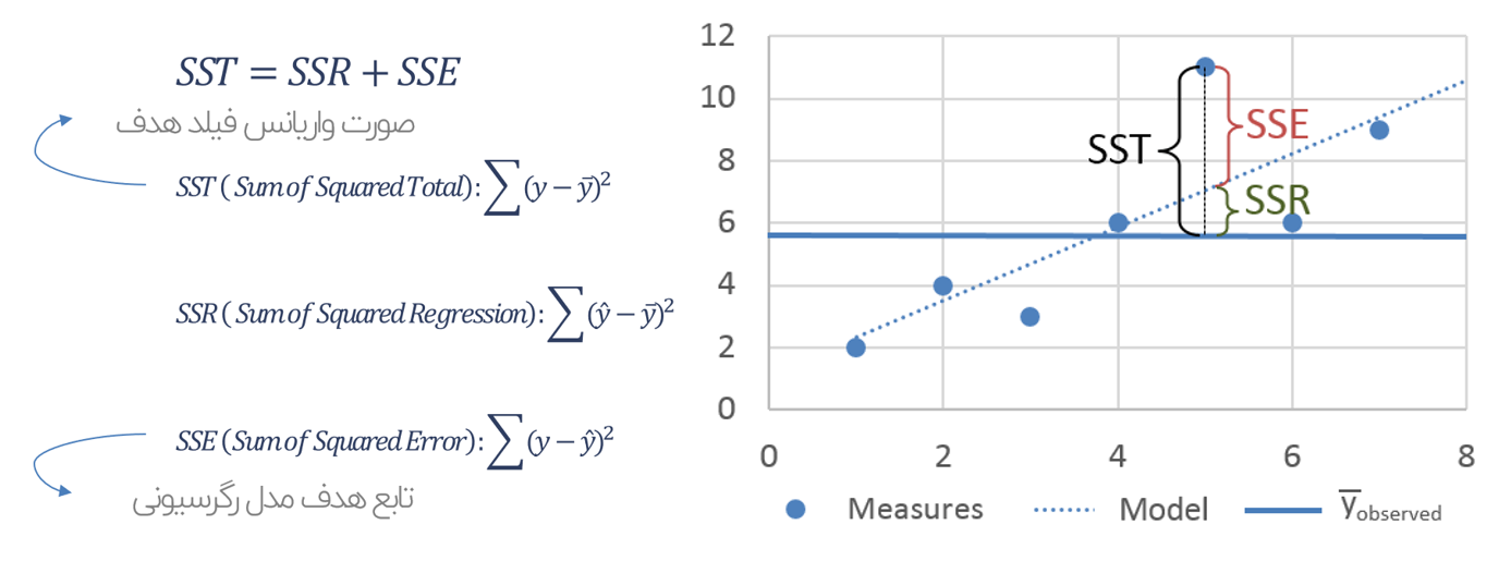 بدیهی است هر چقدر سهم SSR از مجموع مربعات کل داده ها (SST) بیشتر باشد، می توان نتیجه گرفت مدل بهتری خواهیم داشت.