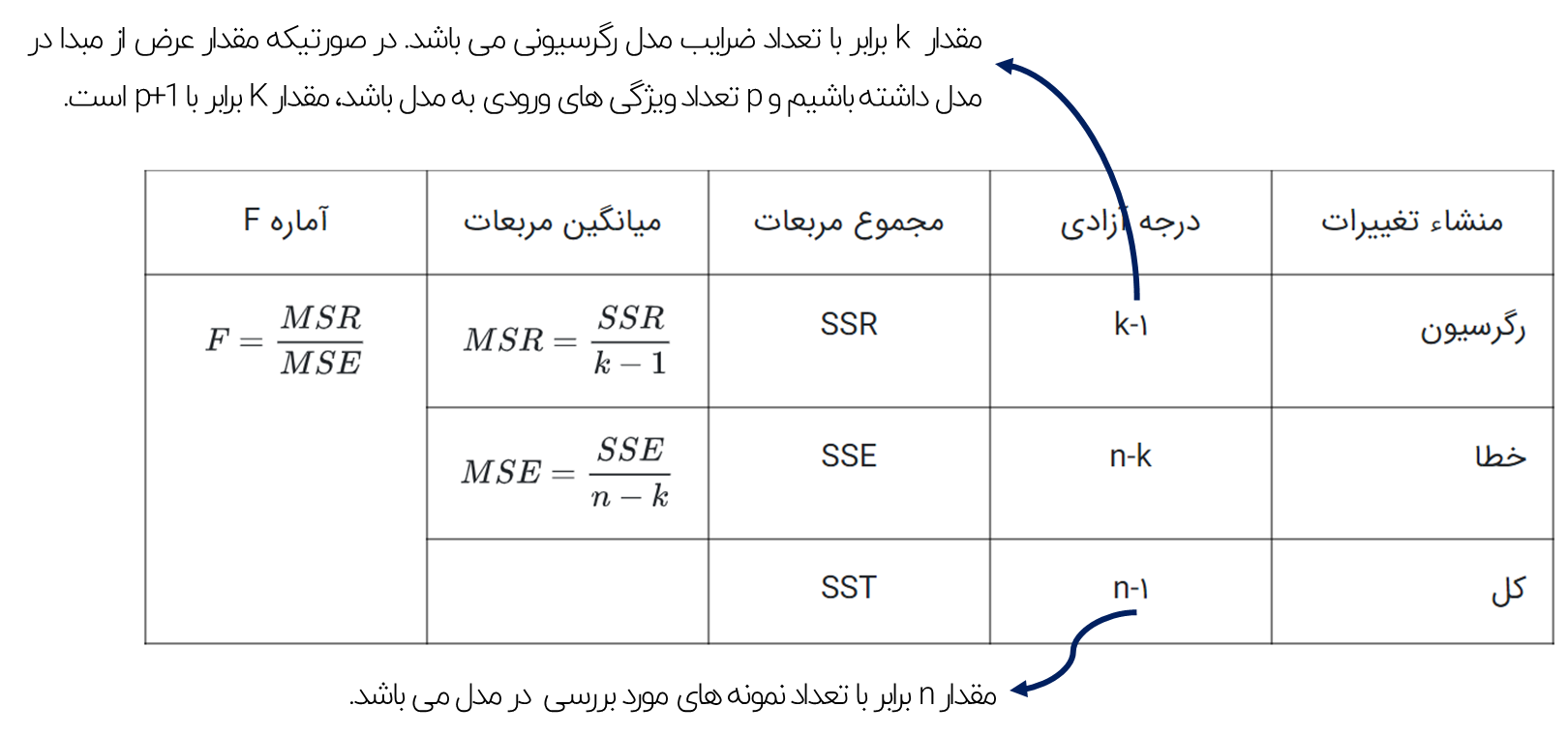 بر اساس جدول تحلیل واریانس ANOVA، پراکندگی (واریانس) مقادیر فیلد هدف به دو بخش تجزیه می شود. بخشی از پراکندگی که توسط مدل رگرسیونی توضیح داده می شود و بخش دیگر از آن که به عنوان جمله خطا در نظر گرفته می شود.