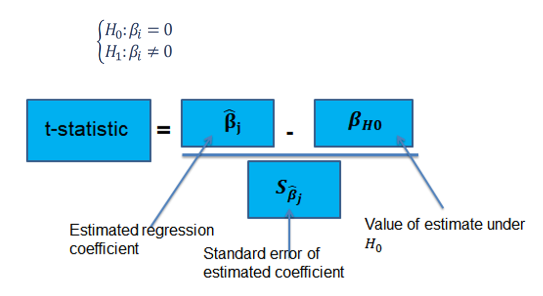 ضرایب مدل رگرسیونی برآورد شده دارای توزیع نرمال با میانگین مجهول  می باشند. بنابراین از طریق آزمون میانگین می توان فرض صفر بودن آنها را مورد بررسی قرار داد. با استفاده از آزمون t اینکار انجام می شود.
