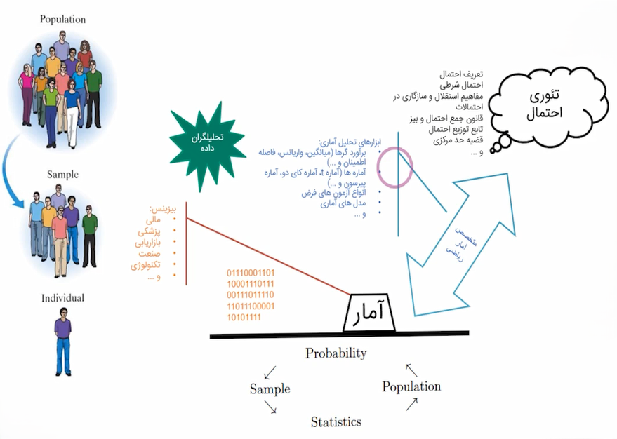 احتمال از کل به جزء حرکت میکند؛ یعنی از جامعه (Population) به نمونه (Sample).