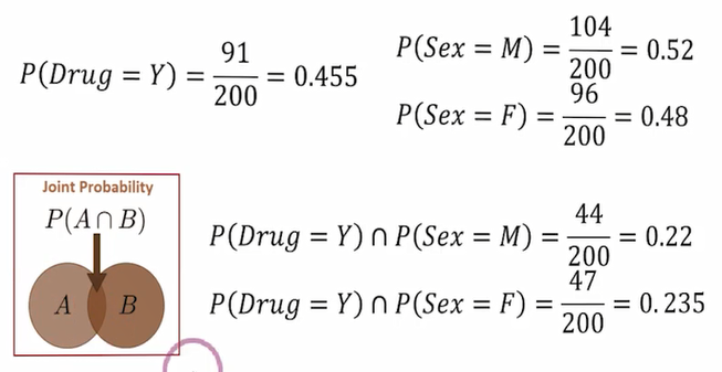 اشتراک A و B: بیمارانی که هم مرد بودند و هم داروی Y دریافت کردند. این تعداد ۴۴ نفر از ۲۰۰ نفر است.