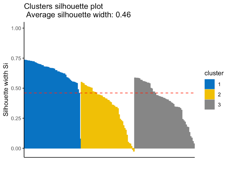 در ارزیابی کلی مدل خوشه بندی مناسب معمولا میانگین معیار سیلوئت بایستی بالاتر از 0.2 در نظر گرفته شود.