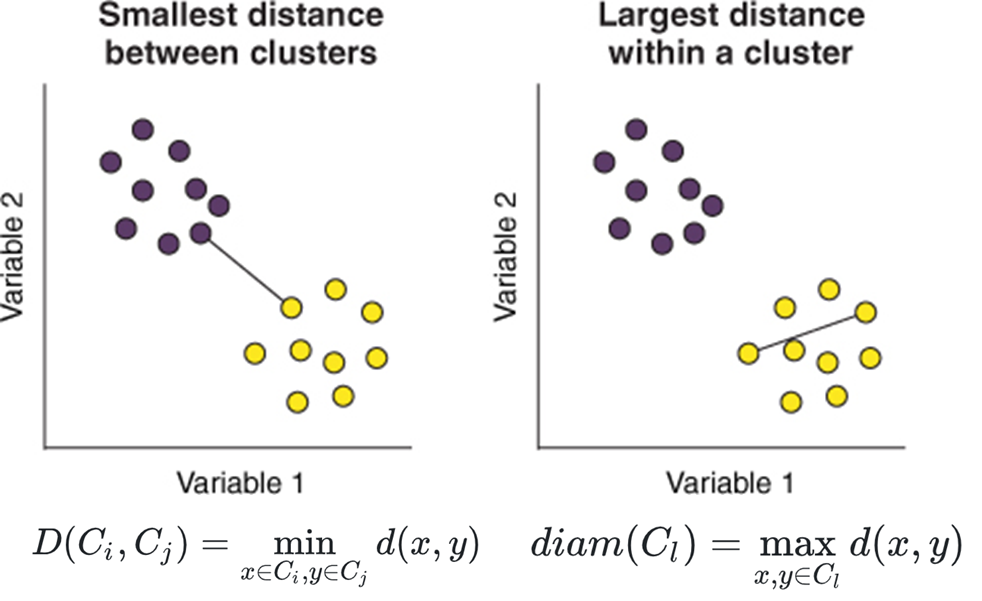 شاخص دان با نسبت کمترین فاصله بین خوشه ها به بیشترین میزان قطر خوشه محاسبه می شود.