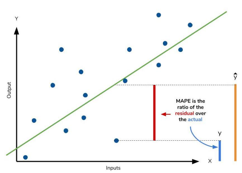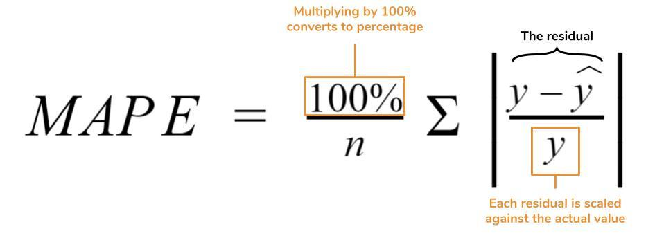 شاخص MAPE شباهت زیادی به MAE دارد، با این تفاوت که اندازه خطای پیش بینی در این شاخص بصورت درصدی از مقدار واقعی بیان می شود. به همین علت تفسیر راحت تری از ارزیابی مدل ایجاد می کند. در صورت برداشتن قدر مطلق از رابطه، می توان جهت مثبت و منفی خطا را در مقدار شاخص Mean Percentage Error مشاهده کرد و مشابه شاخص Mean Error در خصوص امکان سوگیری مدل قضاوت نمود.