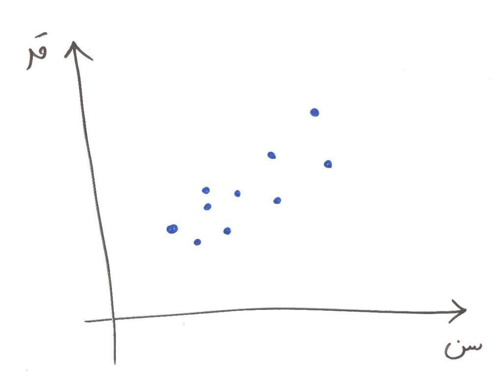 حال بگذارید کمی ریاضیتر به قضیه نگاه کنیم. برای سادگی فرض کنید دادههای مشتریان ما کلا ۲بُعد دارند. سن و قد. حال (همانطور که در درس ویژگی چیست خواندید) آنها را بر روی محور مختصات نمایش میدهیم. فرض کنید شکلی مانند شکل زیر تشکیل میشود: