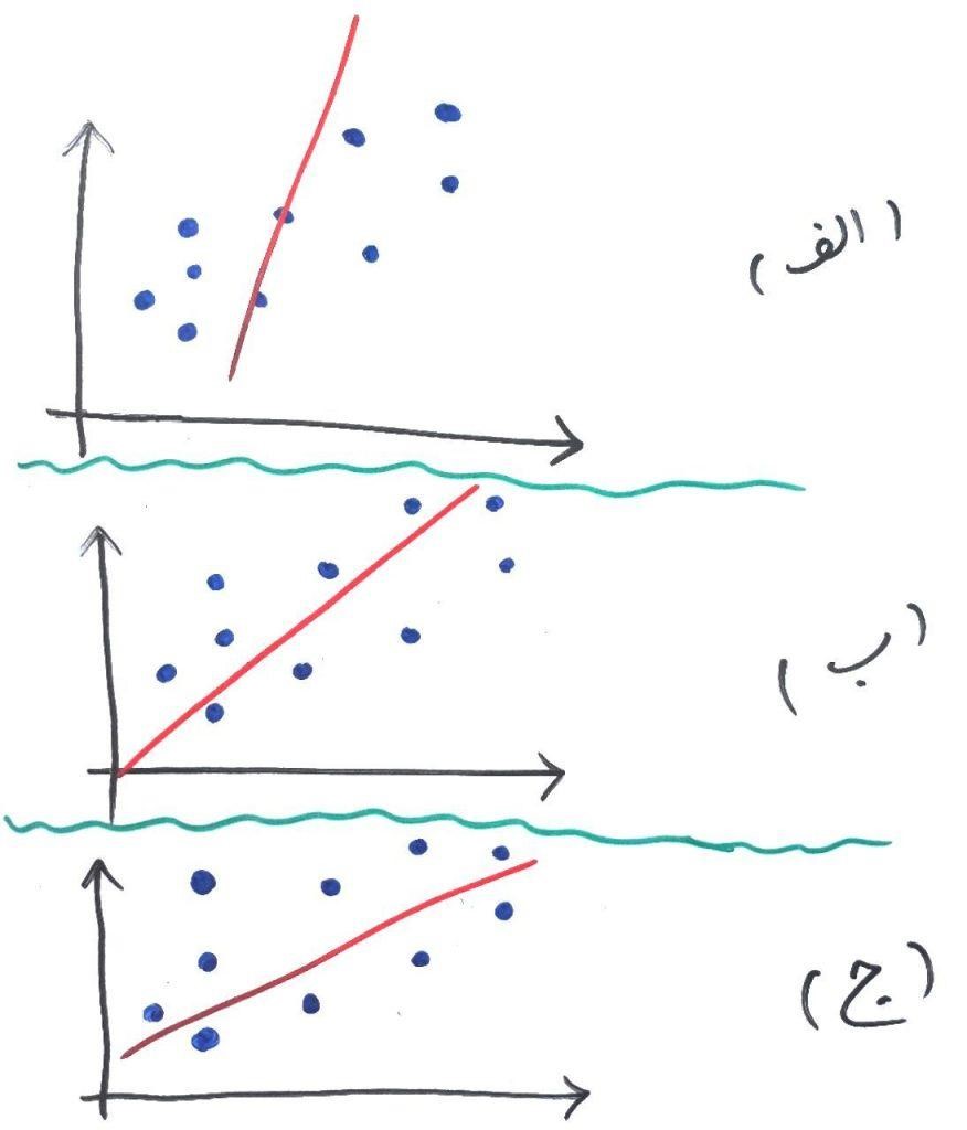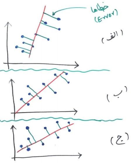 کمی دقت کنید. فاصله نقاط نسبت به خط قرمز با خط با رنگ سبز مشخص شدهاند. اگر جمع این فاصله (خطا – Error) را برای هر نمودار برابر خطای کلی دادهها نسبت به خط قرمز در نظر بگیریم، تصویرِ الف بیشترین میزان خطا را دارد و بعد از آن تصویر ب و در نهایت تصویر ج کمترین خطا را دارد.