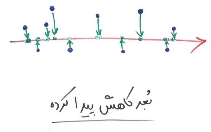PCA به دنبال ساختنِ خطی مانند خط ج است (که در واقع همان بردار ویژه ماست) که کمترین خطا (Least Error) را داشته باشد. با اینکار هر کدام از نقاط بر روی خط قرمز نگاشت میشوند و در تصویرِ بالا که ۲بُعدی است میتوان این ۲بُعد را به ۱بُعد (که همان خط قرمز رنگ است) نگاشت کرد. در نهایت میتواند چیزی مانند شکل زیر رخ دهد: