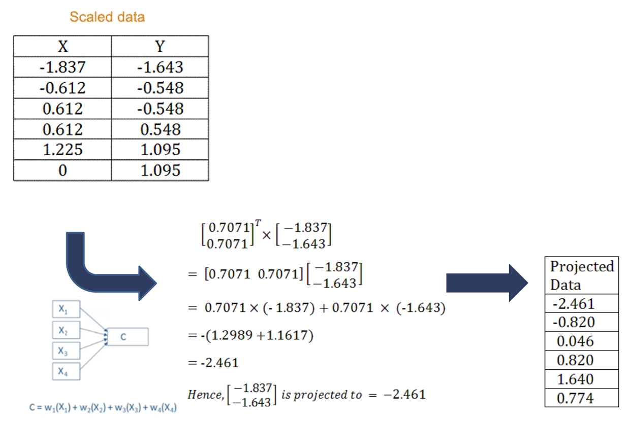 در این مثال آخر ما ۲بُعد را به ۱بُعد کاهش دادیم. البته در مثالهای واقعی ممکن است ۱۰۰۰بُعد را به ۲بُعد کاهش دهند تا بتوان آن را بر روی یک نمودار به نمایش درآورد و این کار با با PCA انجام دهند که هم از سرعتِ معقولی برخوردار است و هم کیفیت قابل قبولی دارد.