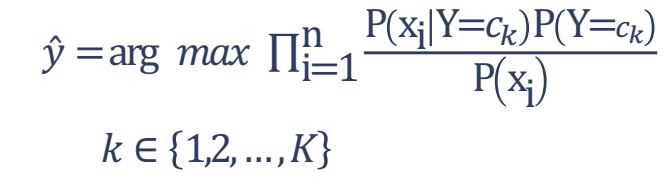 - مقداری از کلاس فیلد هدف 𝑐𝑘 به عنوان رده پیش بینی شده انتخاب می گردد، که مقدار تابع رده بند بیز را بیشینه کند.