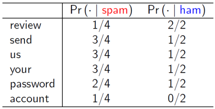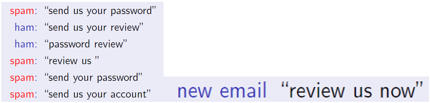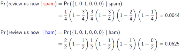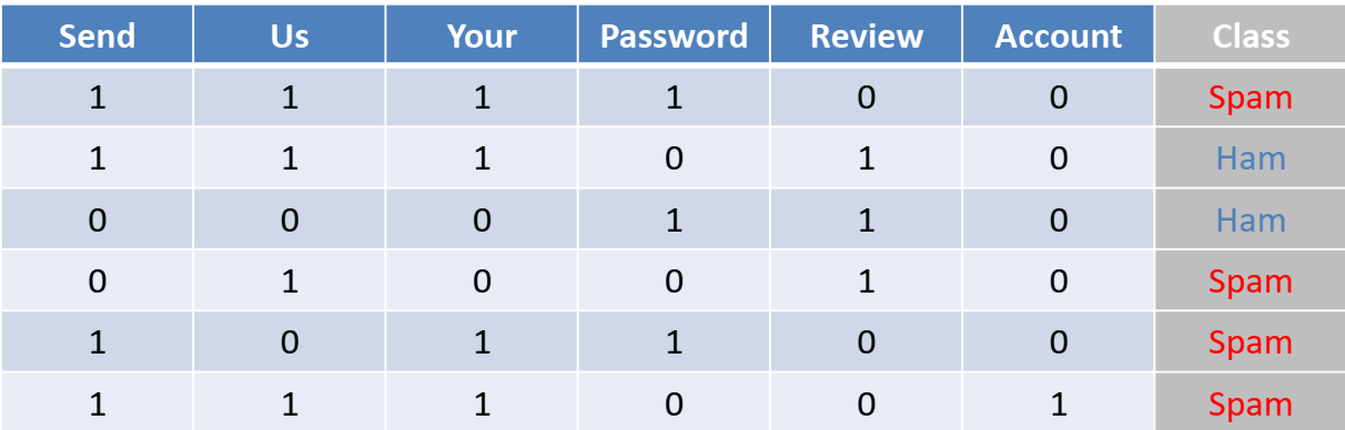 فرض کنید داده های آموزشی در دسترس شامل 6 متن ایمیل مطابق جدول روبرو است که با برچسب های “ham” و “spam” کلاس آنها مشخص شده است. می خواهیم با استفاده از الگوریتم بیز ساده، برچسب ایمیل جدید با متن ” review us now“ را تشخیص دهیم: