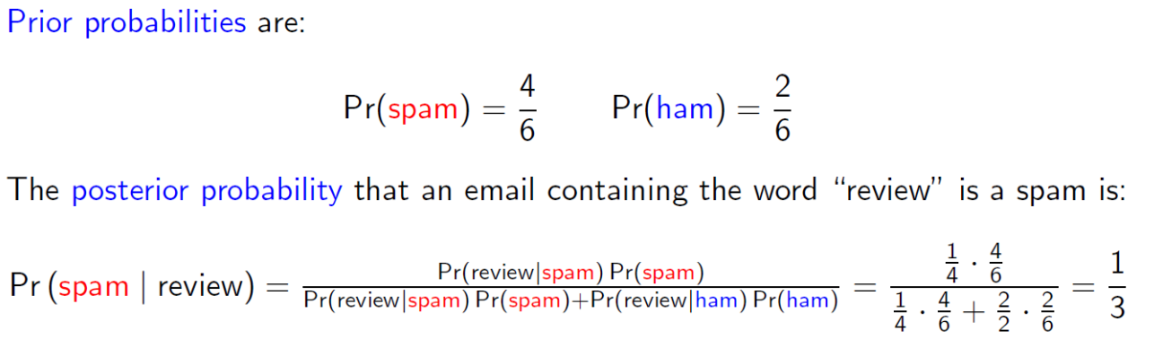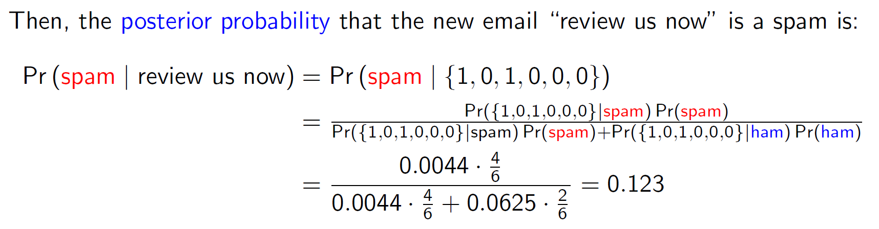 در نهایت محاسبه احتمال پسین برای عبارت ایمیل جدید محاسبه می شود و با توجه به اینکه مقدار آن برای کلاس spam کوچکتر می باشد، در نتیجه با احتمال 0.877 ایمیل جدید متعلق به کلاس ham می باشد.