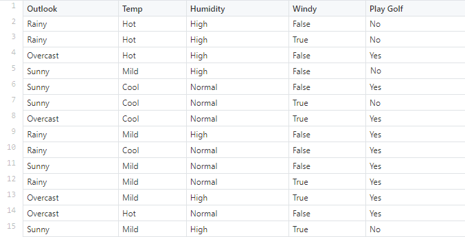 مجموعهدادهای داریم که شرایط آبوهوایی برای بازی گلف را شرح میدهد. با توجه به شرایط آبوهوایی شرایط برای بازی گلف مناسب (بله) یا نامناسب (خیر) طبقهبندی میشود.