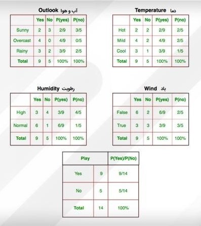 در اینجا احتمال بازیکردن از بین چهارده دادهای که داریم، P (Yes) = 9/14 است و احتمال بازینکردن میان این چهارده داده P (No) = 5/14 است. حال باید احتمالات جداگانهی مرتبط با هر ویژگی، یعنی دما (Temperature)، رطوبت (Humidity)، باد (Windy) و شرایط آبوهوا (Outlook)، را محاسبه کنیم.