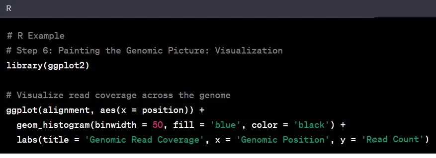 مثال: نمودار کردن پوشش ژنومی میتواند نواحی با عمق توالیسازی بیشتر یا کمتر را آشکار کند و به این ترتیب مسیرهای بیشتری برای مطالعه در آینده فراهم کند.