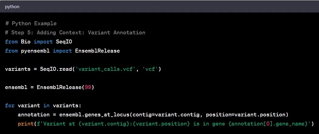 توضیحات واریانت را میتوان به عنوان افزودن زیرنویس به متن ژنومی در نظر گرفت. این مرحله شامل درک اهمیت عملکردی واریانتهای شناسایی شده و تاثیر احتمالی آنها بر ژنها است. این کار مانند رمزگشایی از معنی پشت کلمات در یک کتاب است.