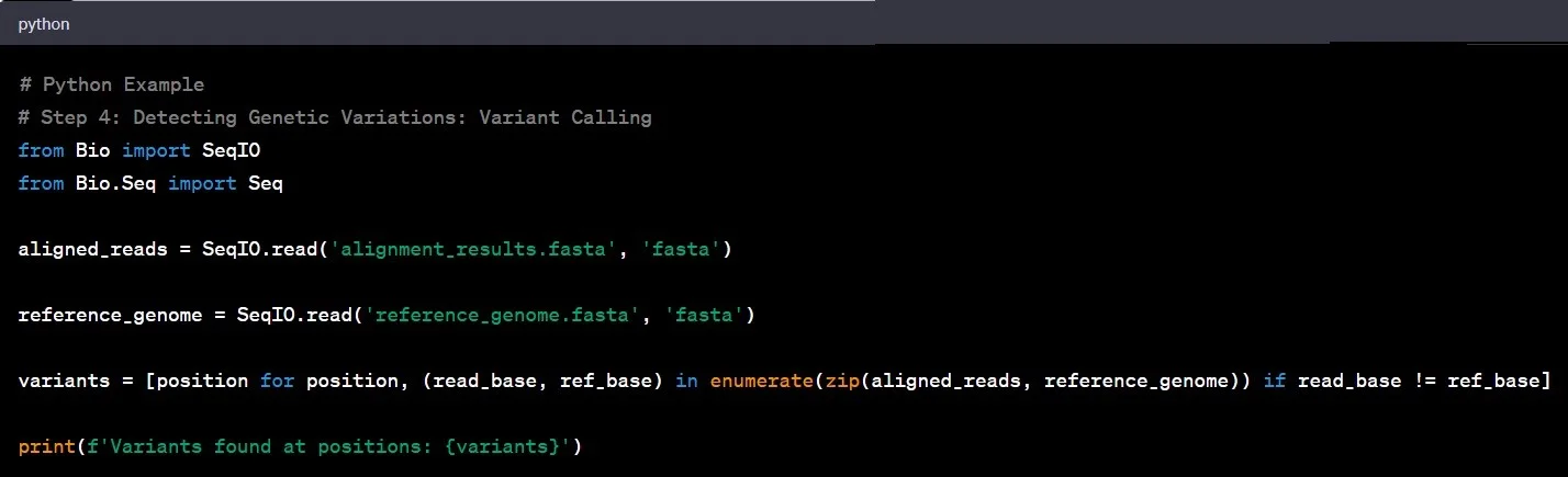 تشخیص واریانت شامل شناسایی تغییرات ژنتیکی، تفاوتهای بین خوانشهای تراز شده و ژنوم مرجع است. نمونههای رایج در تحلیل دادههای ژنومی شامل شناسایی پلیمورفیسمهای تکنوکلئوتیدی (SNP) و درجها/حذفها (indel) از طریق مقایسه خوانشهای تراز شده با ژنوم مرجع است.