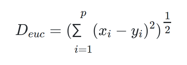 با استفاده از «فاصله اقلیدسی» (Euclidean Distance) کوتاهترین فاصله بین دو نقطه بر طبق رابطه فیثاغورث، محاسبه میشود. اگر x و y دو نقطه با p مولفه باشند، فاصله اقلیدسی بین این دو به صورت زیر قابل محاسبه است: