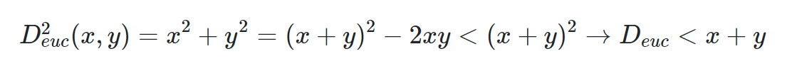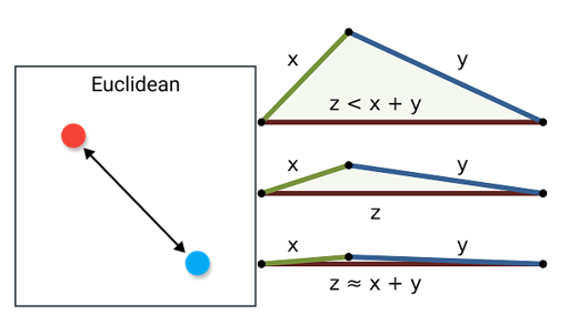 که نشان میدهد فاصله اقلیدسی در نامساوی مثلثی صدق میکند. بر طبق تصویر زیر، نیز میتوان مشاهده کرد که فاصله اقلیدسی در رابطه مثلثی صادق است.