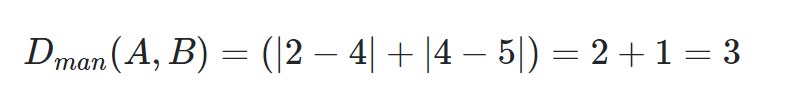 براساس نقاط مربوط به مثال قبلی، فاصله منهتن بین دو نقطه A و B به صورت زیر محاسبه میشود: