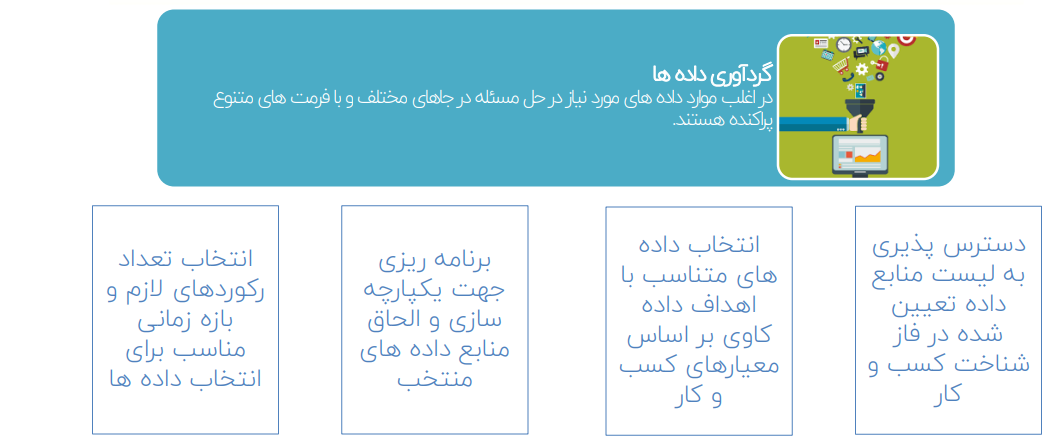 به نوعی باید متوجه شویم که داده های مرتبط با آن کسب و کار با چه روشی، به چه صورتی و در کجا ذخیره می شوند. در قدم اول باید روش دسترسی پذیری به آن داده ها مشخص گردند. سپس باید داده هایی که متناسب با مساله ما هستند را مشخص نماییم و داده هایی که به موضوع ما ربطی ندارند فیلتر نماییم چرا که حجم داده ها زیاد می شوند.