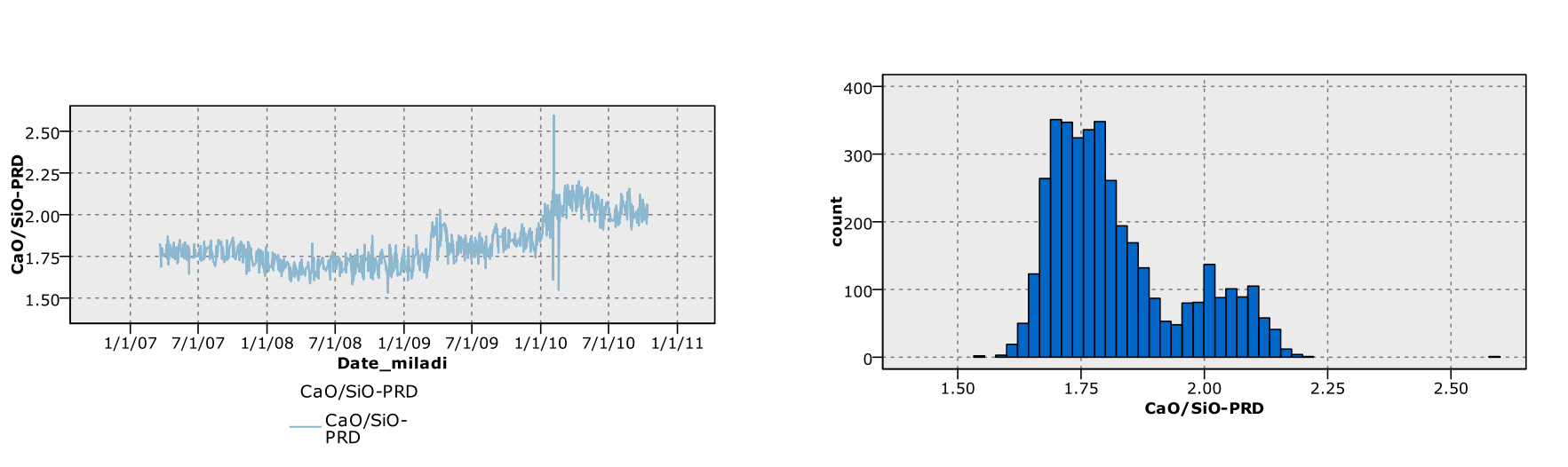 در تصویر زیر داده های مربوط به یک پروژه واقعی در صنعت فولاد را مشاهده می کنیم، از تصویر سمت راست در می یابیم که با گذشت زمان و از یک مقطع زمانی در داده ها شکست و یا تغییر چشمگیر را مشاهده می کنیم (از تاریخ 10/1/1) و در زمانی که نمودار هیستوگرام (شکل سمت راست) متوجه می شویم که تغییر چشمگیری در یک مقطع به وجود آمده است.