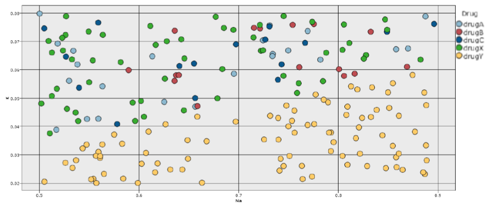 در تصویر زیر نقاط مشخص شده مربوط به بیمارانی است که میزان سدیم و پتاسیم آنها سنجیده شده است و در کنار شاخص های دیگر نوع داروی مورد نیاز برای تجویز مشخص شده است. پس از آنکه از کیفیت اولیه داده ها اطمینان پیدا شد، یک scatter plot مطابق تصویر زیر رسم شد و دیده می شود که گویی داروی Y را توسط یک خط کاملا جدا نماید.