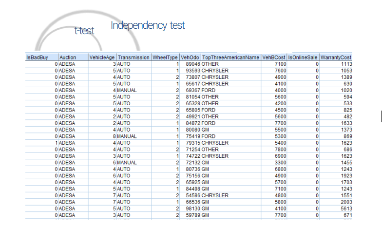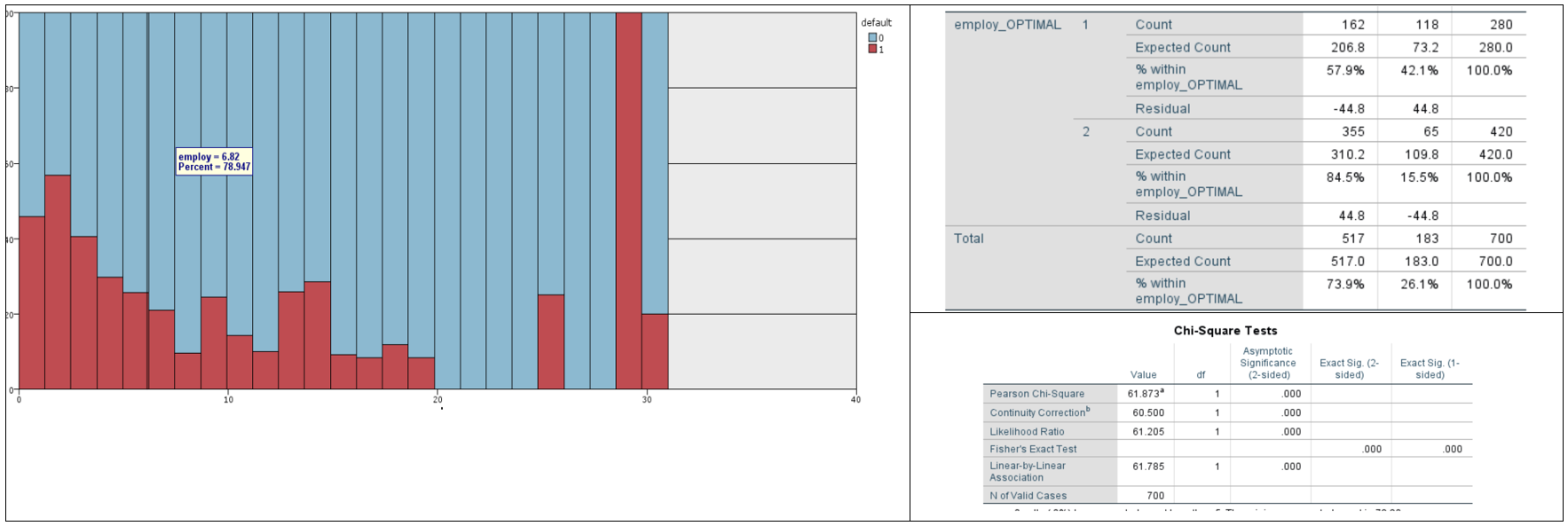مثال مربوط به امتیاز و اعتبار دهی به مشتریان است و می توان به صورت صفر (بد) و یک (خوب) مشتریان را دید که یکی از پارامتر های کمی نمایانگر سابقه و قدمت مشتری است. با توجه به دیتا و مشاهده چولگی در نمودار تصمیم بر این شد که پارامتر کیفی سابقه کار بالا و سابقه کار پایین به عنوان تو پارامتر توصیفی مد نظر قرار داده شود؛ از این طریق رابطه بین مشتری خوب و بد و مشتری با سابقه کار پایین و بالا مورد با استفاده از آزمون استقلال سنجش قرار گرفت. بنابراین یک ویژگی جدید در دیتا ها به وجود آمد.