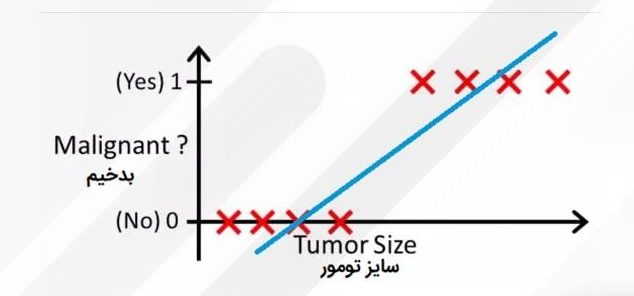 فرض کنید ما مجموعهدادهای داریم که اندازهی تومورها و این امر را که آیا بدخیم هستند یا نه نشان میدهد. اگر این دادهها را روی نمودار ببریم، از آنجا که مسئله طبقهبندی است، تمامی دادهها یا صفر هستند یا یک.