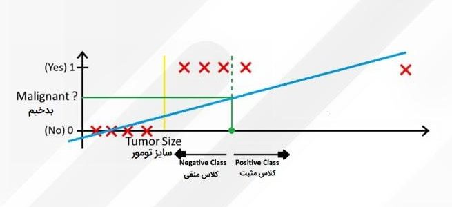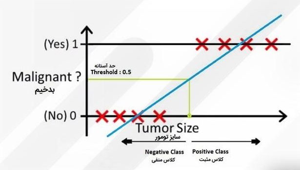 حال اگر از رگرسیون خطی استفاده کنیم، چنین خطی را که در نمودار بالا مشاهده میکنیم به ما میدهد. در اینجا میتوانیم با تعیین یک آستانه (Threshold) در محور x، دادهها را طوری تقسیم کنیم که همهی دادههای موجود در سمت راست آستانهی بدخیم (متعلق به کلاس ۱ یا همان مثبت) و در سمت چپ آن همهی دادههای موجود خوشخیم (متعلق به کلاس صفر یا همان منفی) هستند. در اینجا این آستانه ۰.۵ است.