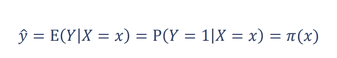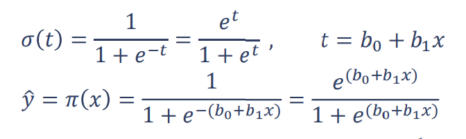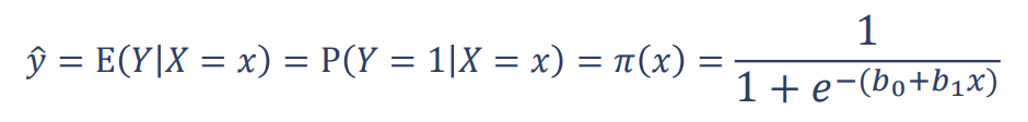 با توجه به اینکه مقدار𝜋(𝑥) در بازه 0 تا 1 قرار می گیرد، بنابراین نیاز است جهت پیش بینی مقدار y از تابعی مانند تابع لجستیک استفاده شود تا مقدار خروجی در بازه 0 تا 1 قرار گیرد. تابع لجستیک برای خط رگرسیون ساده به شکل زیر تعریف می گردد: