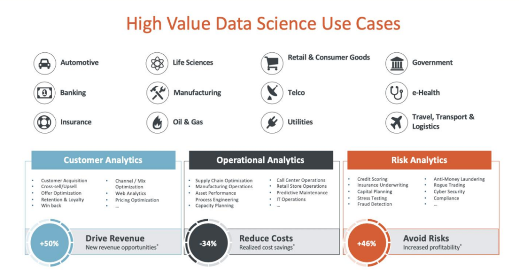 به طور مثال در حوزه تحلیل رفتار مشتریان، استفاده از Data Science در حدی که بتواند تعامل با مشتریان را برای سازمان بهینهسازی کند، میتواند جریان درآمدی را بیش از 50 درصد افزایش دهد.