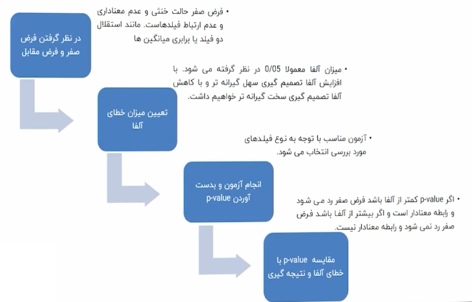 در غیر این صورت فرض H0 رد شده و H1 در سطح خطایα درصد پذیرفته می شود. پس از تایید یا رد H0 ، تحلیلگر باید به طور مشخص بیان کند که آیا فرضیۀ پژوهشی پذیرفته یا رد شده است. بدیهی است محقق هیچ گاه ادعای اثبات یا عدم اثبات فرضیه پژوهشی یا فرضیه های آماری را ندارد، بلکه در تحلیل خود به لحاظ استقرار احتیاط را رعایت کند.