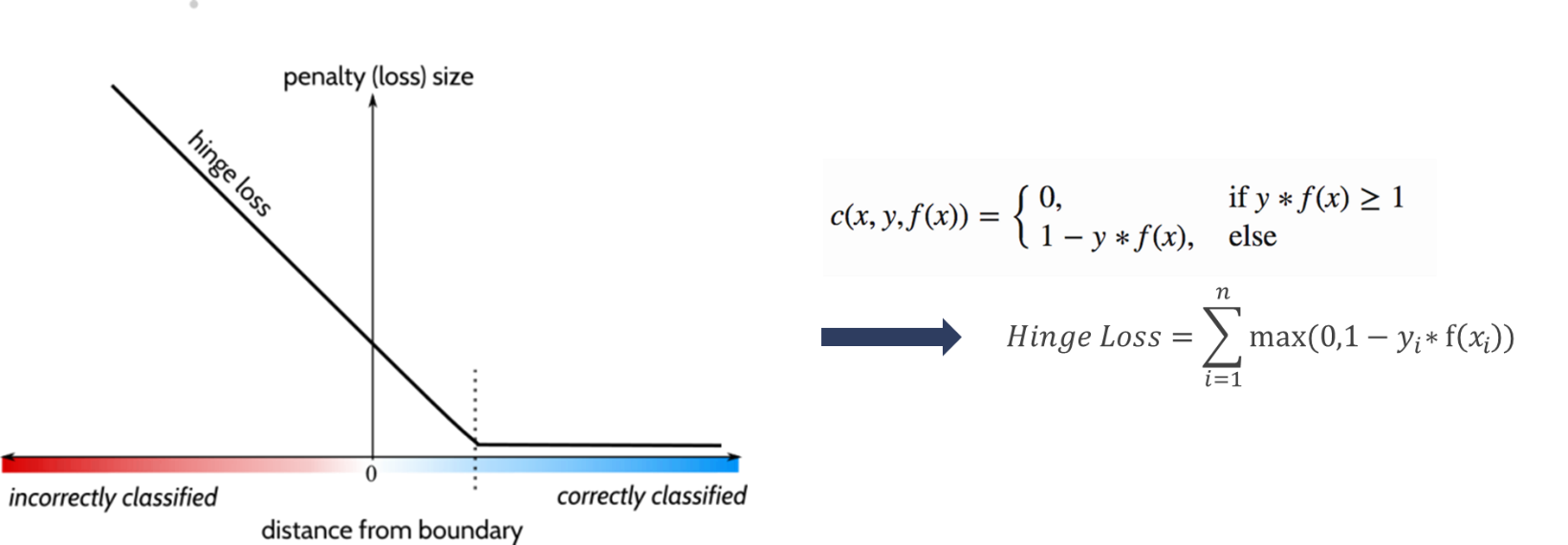 برای تعریف تابع هزینه در الگوریتم SVM، برای خطاهای پیش بینی شده طبق رابطه زیر مقدار هزینه (زیان) تعریف می شود:
