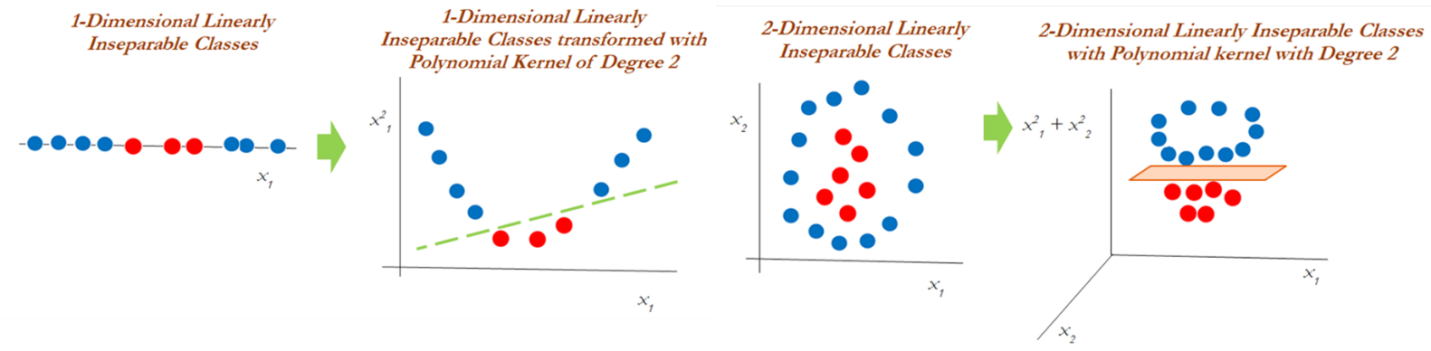 در صورتی که الگوهای موجود در داده ها قابلیت جداسازی بصورت خطی نداشته باشد، با استفاده از توابع تبدیل کرنل جهت نگاشت داده های غیرخطی به فضای ویژگی های جدید به طوری که قابلیت تفکیک خطی داشته باشد، انجام می شود.