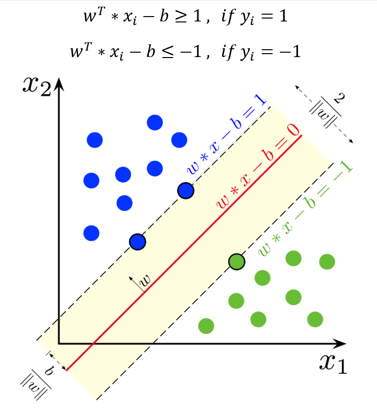 بر اساس مفهوم بردار نرمال w در هندسه تحلیلی ثابت می شود، فاصله بین دو خط مرزی که به عنوان حاشیه (Margin) شناخته می شود، برابر با 2 برابر معکوس نرم دوم w می باشد.