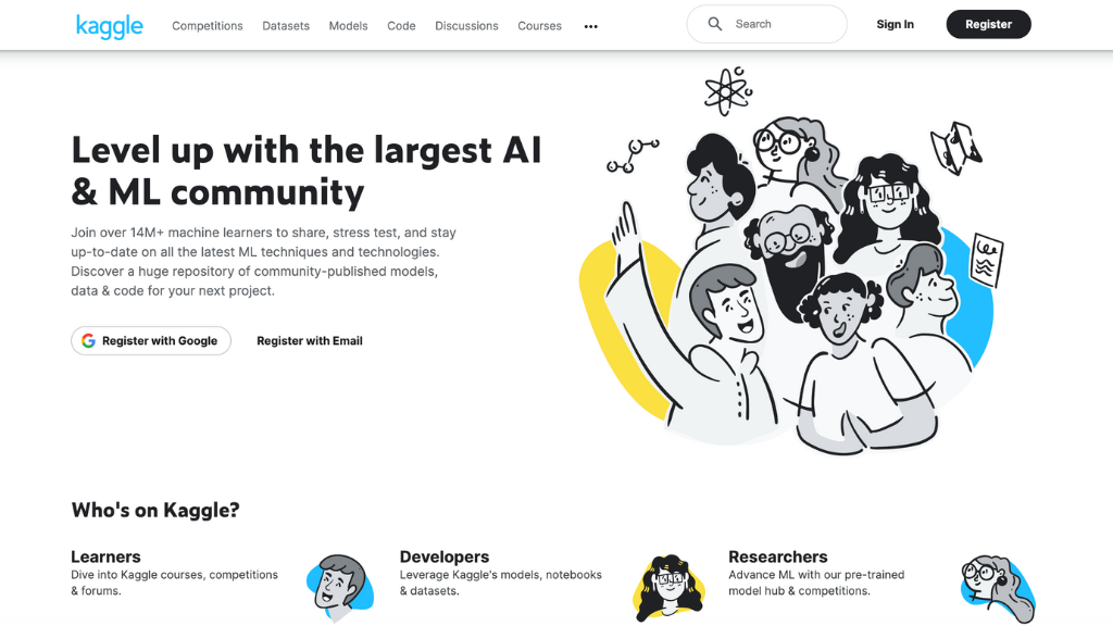 در این جلسه قصد داریم با پلتفرم Kaggle آشنا شویم؛ پلتفرمی بسیار مهم و پرکاربرد برای فعالان حوزهی هوش مصنوعی و یادگیری ماشین. همانطور که در تصویر صفحهی اصلی این سایت نیز مشاهده میشود، Kaggle خود را بهعنوان یک کامیونیتی در حوزهی AI و ML معرفی کرده است که تاکنون بیش از 14 میلیون کاربر فعال دارد. این پلتفرم مجموعهای از خدمات متنوع را در اختیار افرادی قرار میدهد که در این حوزهها فعالیت میکنند.