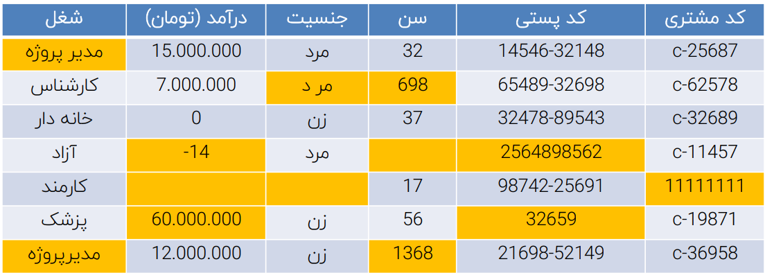 مطابق تصویر فوق فیلد هایی که به رنگ نارنجی در آمده اند دارای مشکلاتی نظیر ثبت دیتاهای اشتباه، با فرمت ناهمسان با فیلدهای مشابه، داده های غلط، داده های پرت و… مواجه هستیم. در صورتیکه پاکسازی داده ها انجام نشود و با داده های در دست وارد مرحله مدل سازی و بهره برداری از آن بشویم مطمئناً نتایج نامعتبری را بدست خواهیم آورد.