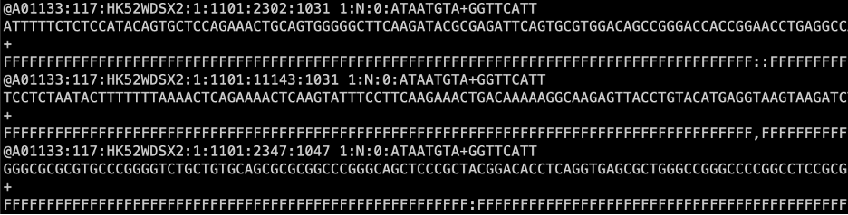 در حال حاضر، خواندن ژنوم از موقعیت ۱ تا انتها به طور همزمان امکان پذیر نیست، بلکه ژنوم به قطعات کوتاه حدود ۴۰۰ جفت باز (bp) بریده میشود و هر دو انتها با طول تقریباً ۱۵۰ جفت باز خوانده میشود. این فایلها با نام FASTQ شناخته میشوند.