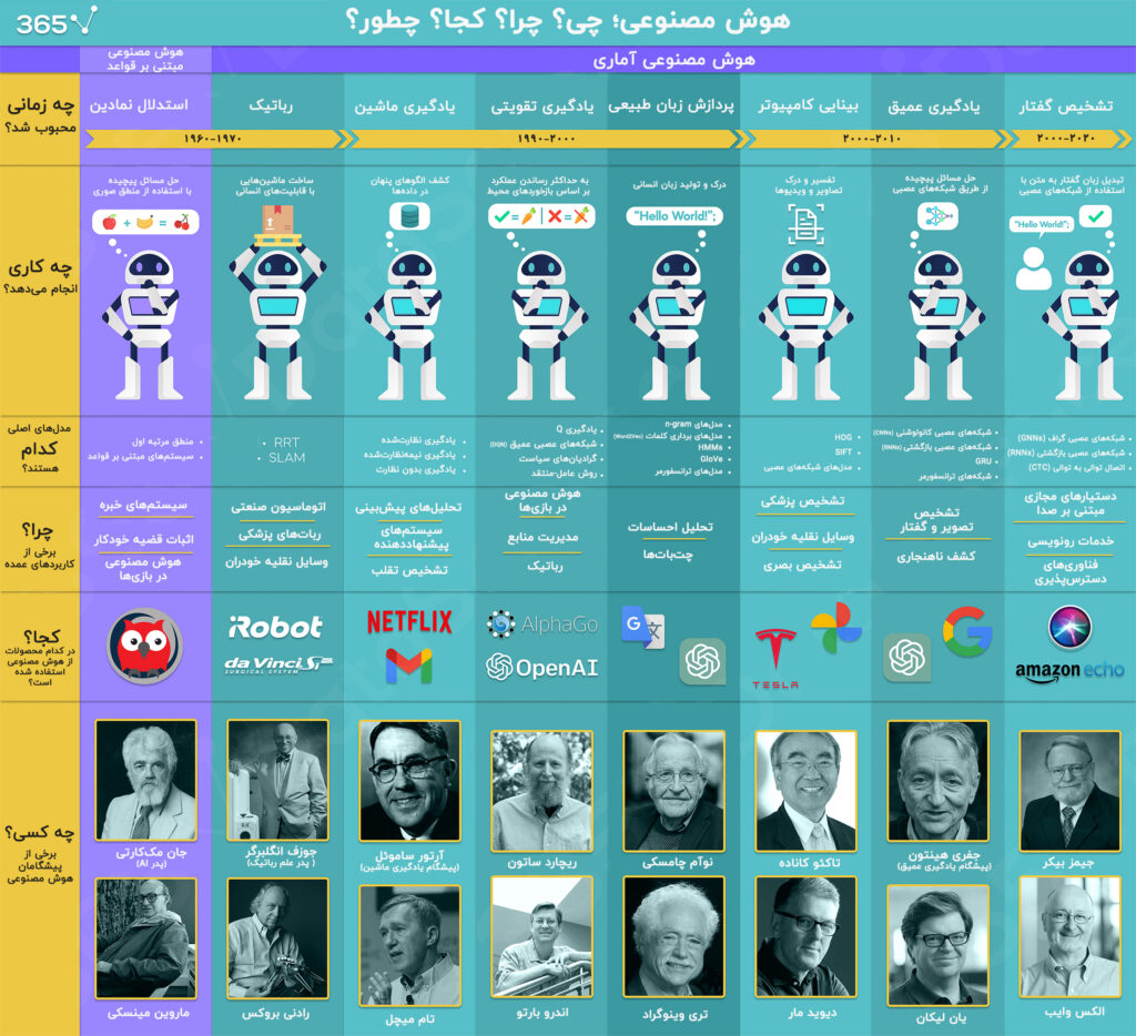هوش مصنوعی، یکی از انقلابیترین فناوریهای عصر حاضر، جنبههای متعددی از زندگی انسان را تحت تأثیر قرار داده است. این اینفوگرافی شما را با جنبههای مختلف هوش مصنوعی، از تکنولوژیها و ابزارهای پیشرفته مانند شبکههای عصبی و یادگیری عمیق، تا کاربردهایی مانند تشخیص تقلب و دستیارهای صوتی، آشنا میکند. همچنین در بخشی از این تصویر، به معرفی پیشگامان این علم پرداخته شده است که با نوآوریهای خود، نقش کلیدی در توسعه آن داشتهاند.