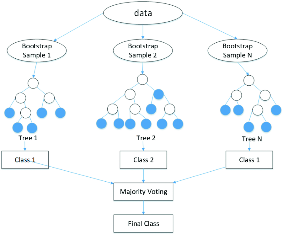 الگوریتم جنگل تصادفی در چارچوب رویکرد Bagging با در نظر گرفتن الگوریتم درخت تصمیم هرس نشده (با عمق زیاد) به عنوان مدل پایه، تعداد بسیار زیادی مدل بیش برازش شده دارای بایاس کم ایجاد نموده و با رای گیری یا میانگین گیری از پیش بینی مدل های پایه از بیش برازش کلی مدل جلوگیری می کند.