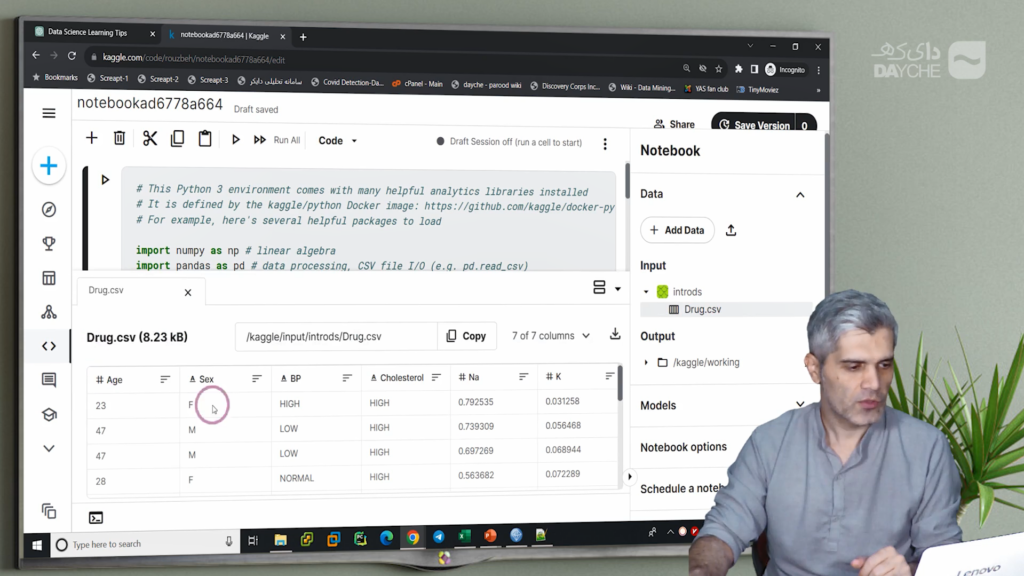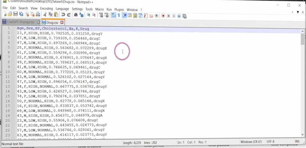 در این فایل، دادهها با کاما (,) از هم جدا شدهاند. هر سطر یک رکورد است. سطر اول، نام فیچرهاست و سطرهای بعدی مقادیر مربوط به هر رکورد هستند. فیچرهایی مثل سن، جنسیت، فشار خون، کلسترول، سطح سدیم و پتاسیم وجود دارند و در نهایت ستون مربوط به داروی تجویزشده قرار دارد. این داروها در چند کلاس دستهبندی شدهاند، بنابراین با یک متغیر کیفی طرف هستیم. مسئلهی ما از نوع Classification یا طبقهبندی است و در دستهی یادگیری با ناظر (Supervised Learning) قرار میگیرد.
