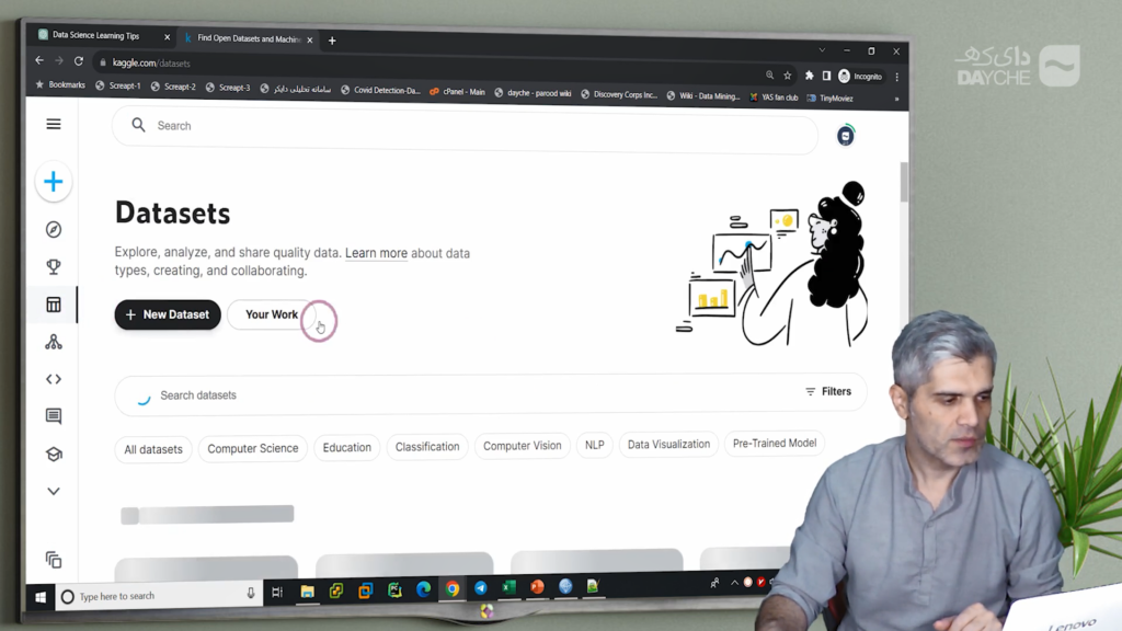 ما در این پروژه عمدتاً از دو بخش “Datasets” و “Notebooks” استفاده خواهیم کرد. این دو بخش به هم مرتبطاند. مثلاً اگر قبلاً روی یک دیتاست کدی نوشته باشید، وقتی آن را باز کنید، به نوتبوک مربوطه متصل خواهد شد و بالعکس. اما برای سازماندهی بهتر، ترجیح میدهیم از بخش دیتاست شروع کنیم.
