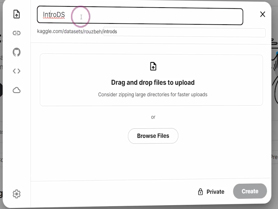 در صفحهی Datasets میتوانید یک Dataset جدید بسازید. مثلاً یک پوشه بهنام intro-ds ایجاد میکنیم. این پوشه در واقع فضای دیسکی است که Kaggle در اختیار شما میگذارد. در این پوشه میتوانیم فایل دادهی خود را آپلود کنیم. پس از ساخت پوشه، مسیری به آن اختصاص داده میشود بهصورت: