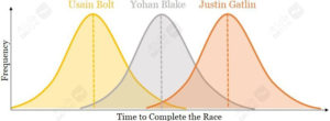 پیش از آنکه توضیح بدهم چطور میتوانید این کار را بکنید، اجازه دهید به مدالگیرندگان المپیک ۲۰۱۲ برگردیم. برای مثال، اگر اُسین بولت را مجبور کنیم هزار بار دو ۱۰۰ متر را بدود، او هر دور را با زمانبندی متفاوتی به پایان میرساند؛ بیشتر نزدیک به زمان رکوردش در المپیک. همین امر برای سایر مدالگیرندگان، یوهان بلیک و جاستین گاتلین هم واقعیت دارد. بهخاطر ماهیت بحث، توزیعهای زیر را برای زمان رسیدن به خط پایان هر سه مدالگیرنده فرض میگیریم. توزیعهای زیر همگی نرمال یا گوسی هستند. توزیع نرمال فرضیهی خوبی برای بیشتر پدیدههای طبیعی مثل دویدن با سرعت انسانها است.