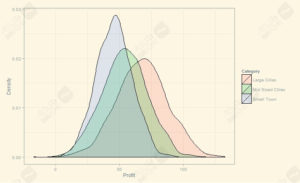حالا سؤال دوم این است که آیا این مقادیر متوسط تفاوت قابلتوجهی دارند یا نه.این پرسش را میتوان با استفاده از توزیعهای مربوط به دستهی مکانی کل ۴۲۰۰ مشتری پاسخ داد. شکل بالا نمایشی از این توزیعها (به سمت راست) را ارائه میدهد. برای دادههای اصلیمان، شکل زیر توزیع تراکم مربوط به دستهی مکانی کل این ۴۲۰۰ مشتری را ارائه میدهد. توجه کنید که سود بهخاطر کالاهای برگشتی توسط مشتریان و سایر زیانها، در برخی موارد در این توزیع منفی است.